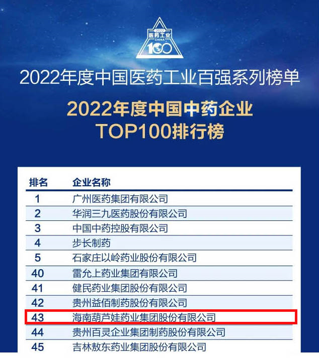 AG庄闲药业集团连续4年荣登“中国中药企业TOP100排行榜”,排名上升至第43位